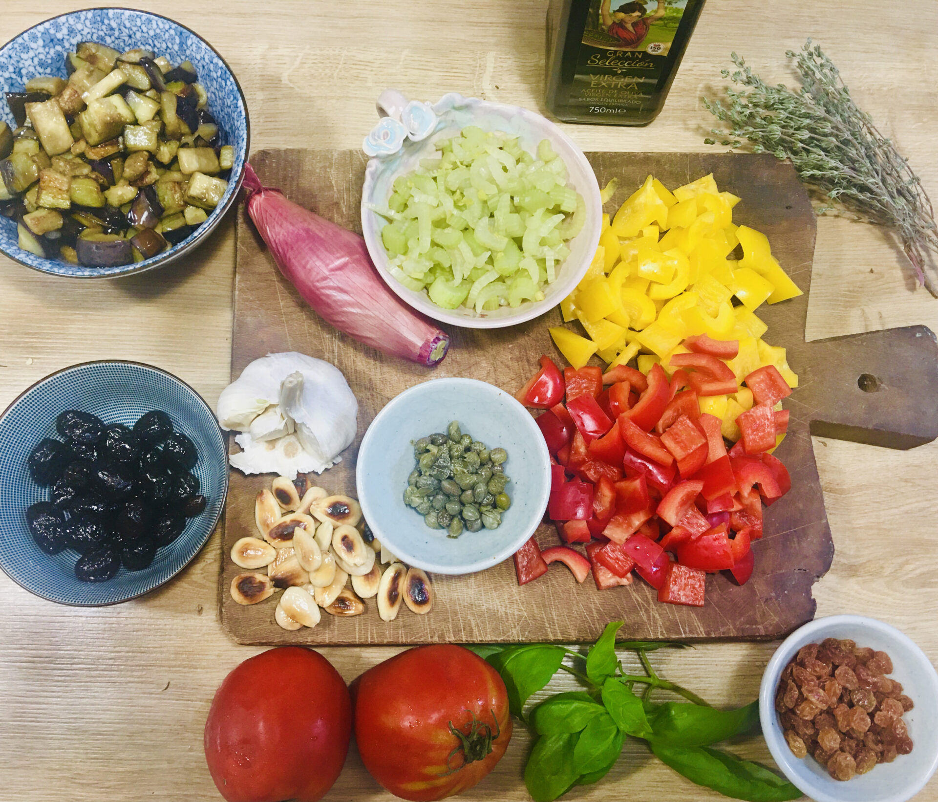 In the same frying pan you used to fry the aubergines, use the leftover oi to fry the chopped onions to soften. As soon as they are transparent add the garlic for 1-2 minutes. Now add the diced peppers, and when softened add the celery, olives, raisins and capers.. Finally stir in the chopped tomatoes, the fried aubergines, and the pine nuts. Taste and adjust the seasoning with a pinch of sugar, a teaspoon of vinegar and, if necessary, a pinch of salt.