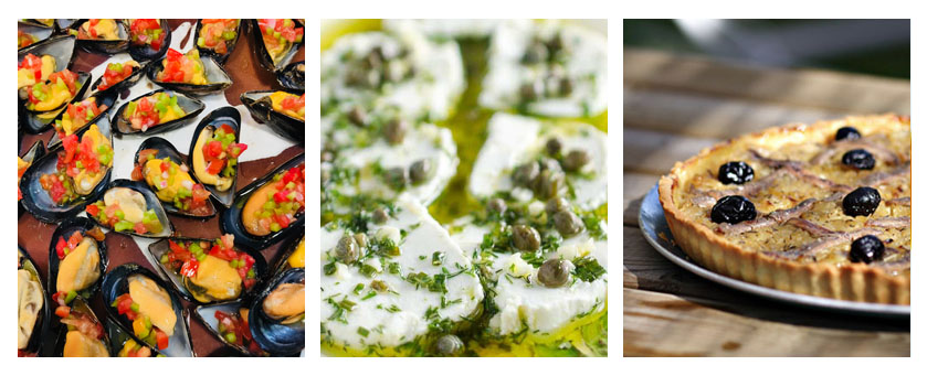 Nos plats changent selon les saisons – en été on peut faire des fleurs de courgettes farcies ou des moules farcies avec sa sublime et polivalente salsa pesquière.. ou encore des gambas flambées au pastis… On peut aussi faire une pissaladière avec ses oignons doux et anchois salés, une fougasse au roquefort et noix ou une tapenade au tomates sechées.. ou puis encore des petites tomates Provençales, des beignets de sauge et anchois.. Et que direz-vous d’une Brandade de Nimes? Trop bonnes toutes ces idées délicieuses!!!