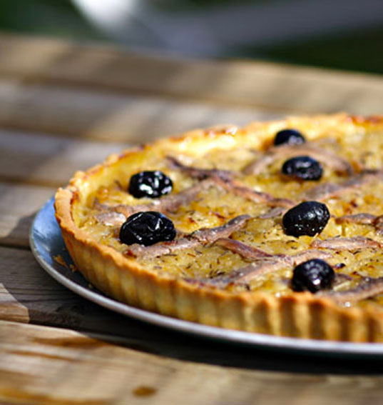 Étalez la pâte avec les oignons cuits. Coupez les anchois en deux sur la longueur (les ciseaux sont un moyen facile de le faire) et disposez-les sur les oignons en treillis ou en étoile, puis parsemez des olives coupées en deux. Cuire au four 20 minutes, jusqu’à ce que la pâte soit dorée. Servir tiède.