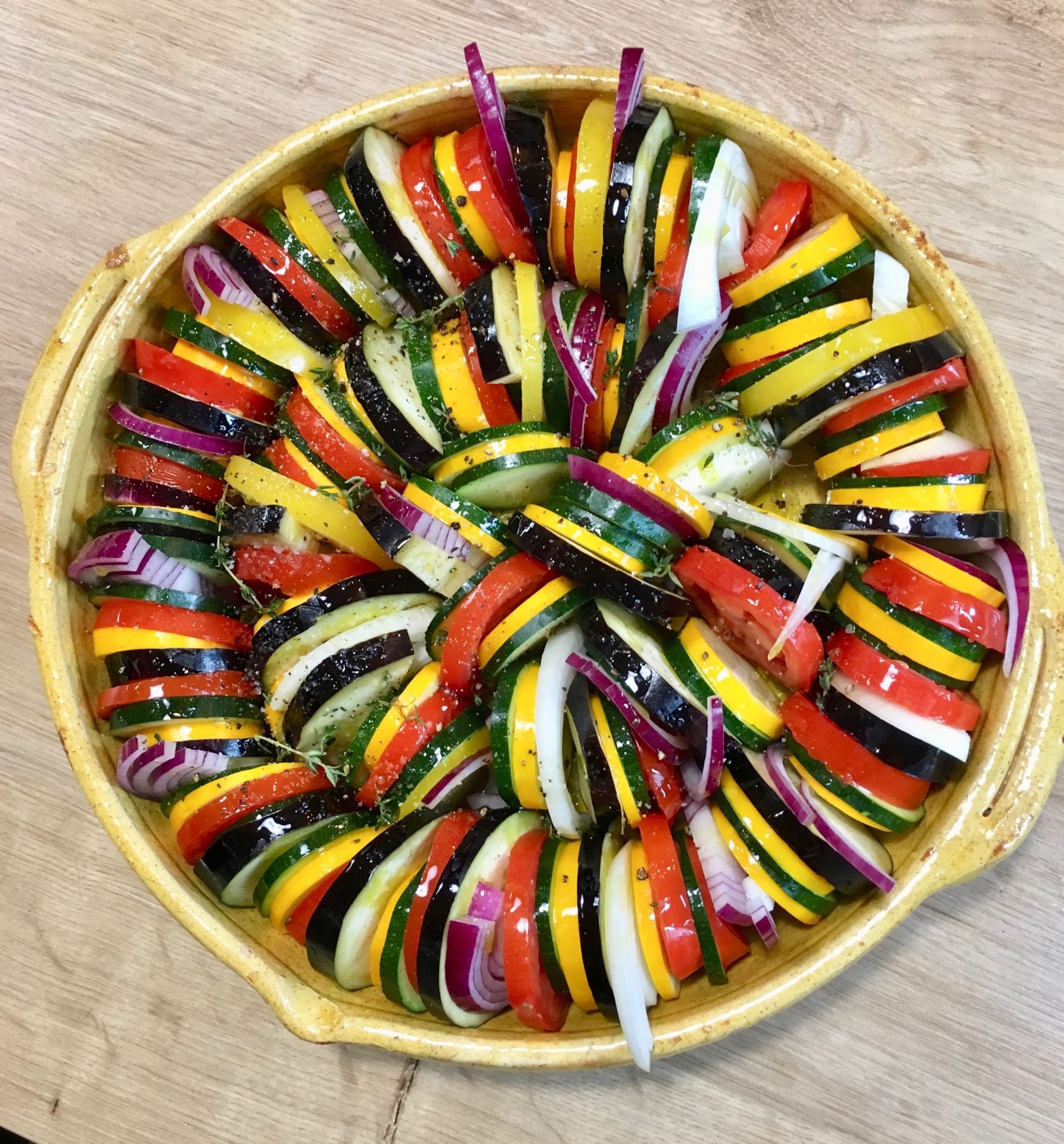 Provençals have invented many different dishes for their colourful summer vegetables, from ratatouille to petits farcis niçois and this tian is one of them. This recipe is called after the roughly glazed oven dish it is cooked in, and it generally does not contain peppers. It’s baked for an hour and can be eaten warm or cold. Enough for 10.