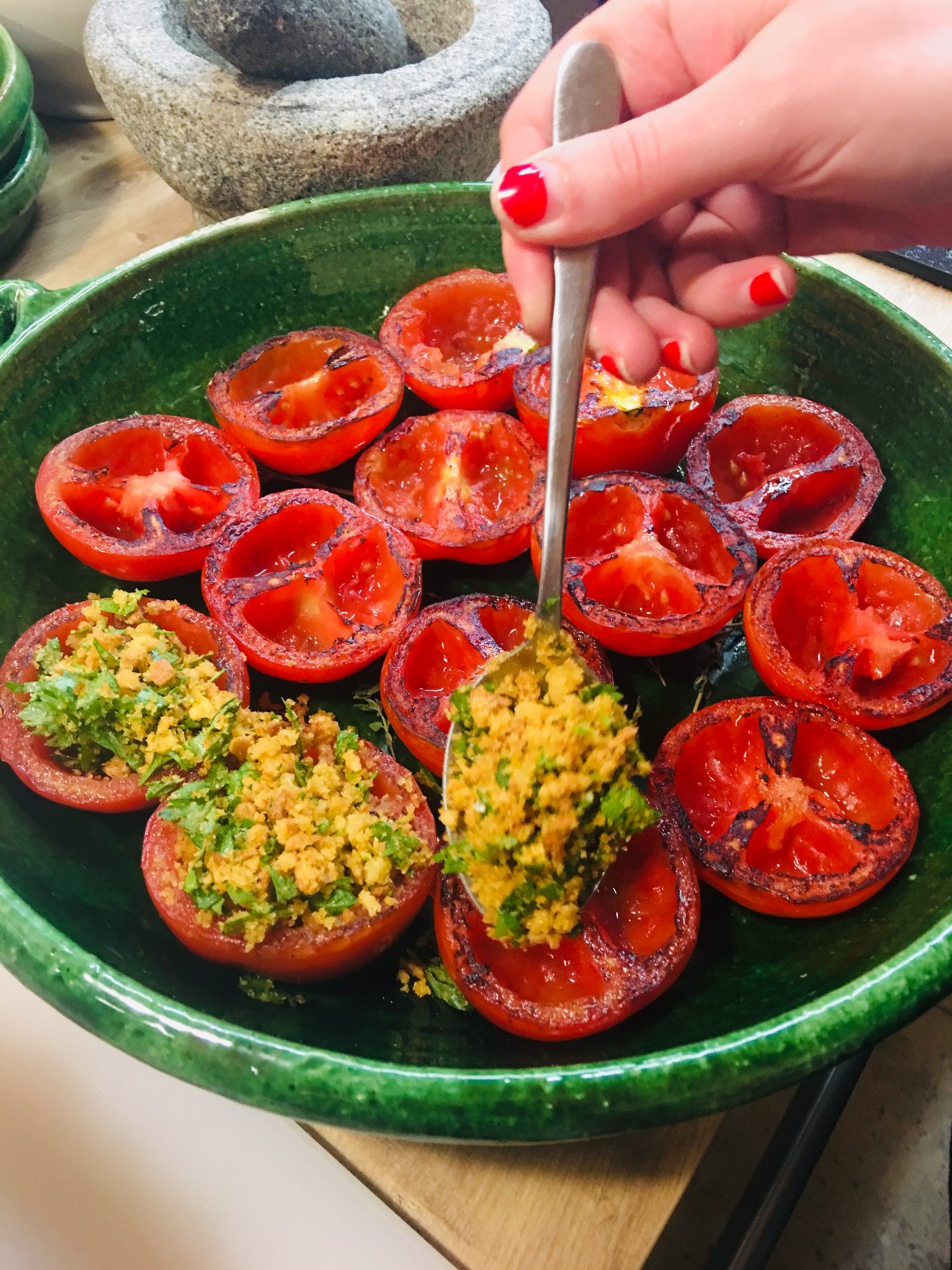 Chauffer une grande poêle jusqu’à ce qu’elle soit bien chaude, ajouter un peu d’huile d’olive et faire revenir les tomates, côté coupé, pendant quelques minutes jusqu’à les bords soient carbonisés. Mettez-les dans un plat allant au four et assaisonnez avec du sel, du poivre (et quelques graines de sucre si vos tomates ne sont pas mûries au soleil). Mélanger la chapelure avec le persil haché, l’ail et un généreux filet d’huile d’olive, puis verser le mélange dans les tomates. Arroser encore d’huile d’olive et cuire 30 minutes.